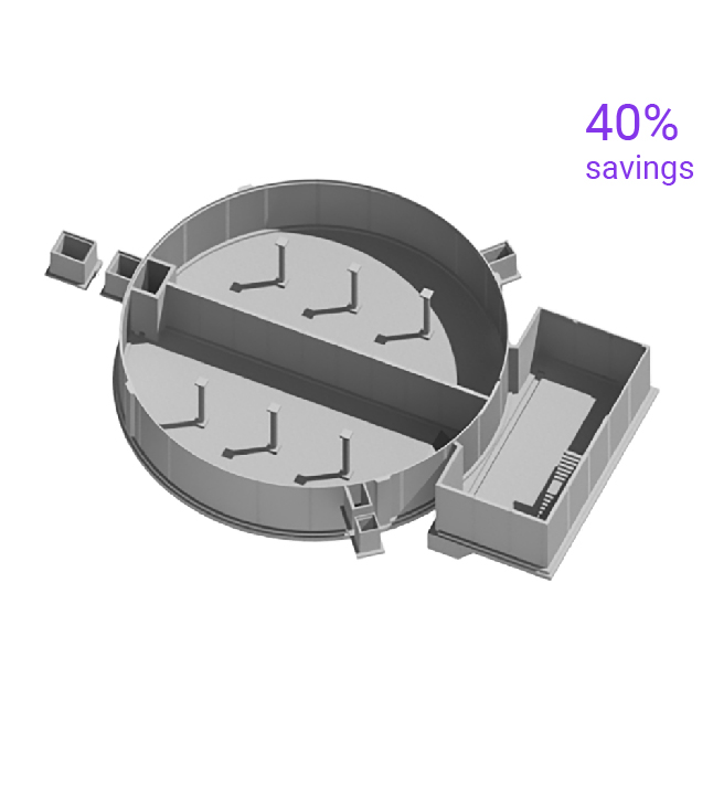In a project in 2019, we saved the equivalent of almost a quarter of the total concrete and more than a third of the total steel used to construct the Burj Khalifa [1]. We received design drawings consisting of 39 industrial storage tanks designed to hold the effluent of a wastewater treatment plant (Figures 1 – 3). We developed our tech, using algorithms, to generate numerous structural optimization solutions. Our algorithms computed a solution that resulted in a reduction of 78,000 cubic meters of concrete (from the original 180,000 cubic meters) and 15,000 tons of reinforcement steel ⓘ (from the original 35,000 tons). This translated into a total reduction of 43% in the volume of structural materials and 42% of CO2 emissions, in addition to improving both the structural integrity and the functionality of the tanks ⓘ. The optimized tanks resulted in material savings of 71,986 tons of CO2 emissions equivalent to that of the annual energy use of 33,266 U.S homes [2]. The emissions saved would equate to removing 58,737 cars from the road for a year [2] and constituted fiscal savings of $24 million (88.15 million AED).