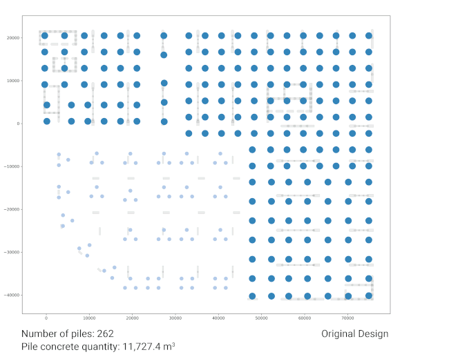 VAES.ai is producing iterations and studying how to attain optimal concrete and steel usage with alternative piles dimensions and layout.